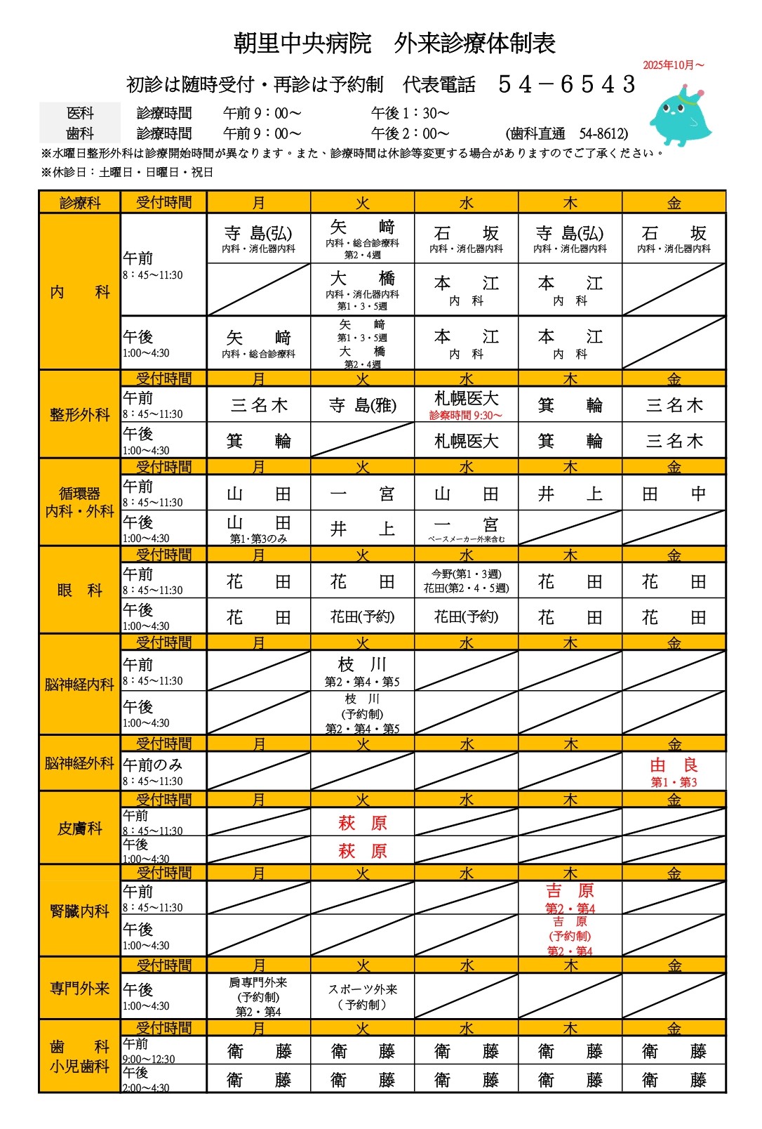 - 10月29日(水) 整形外科 森→山本慎太郎 代診