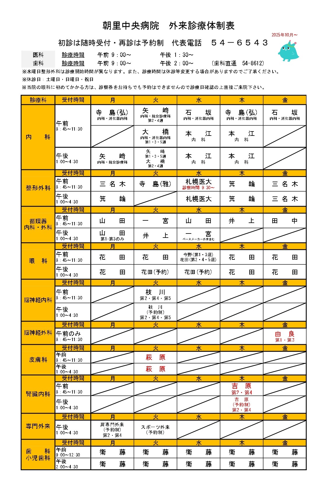 - 12月11日(木) 腎臓内科 吉原 真由美 休診