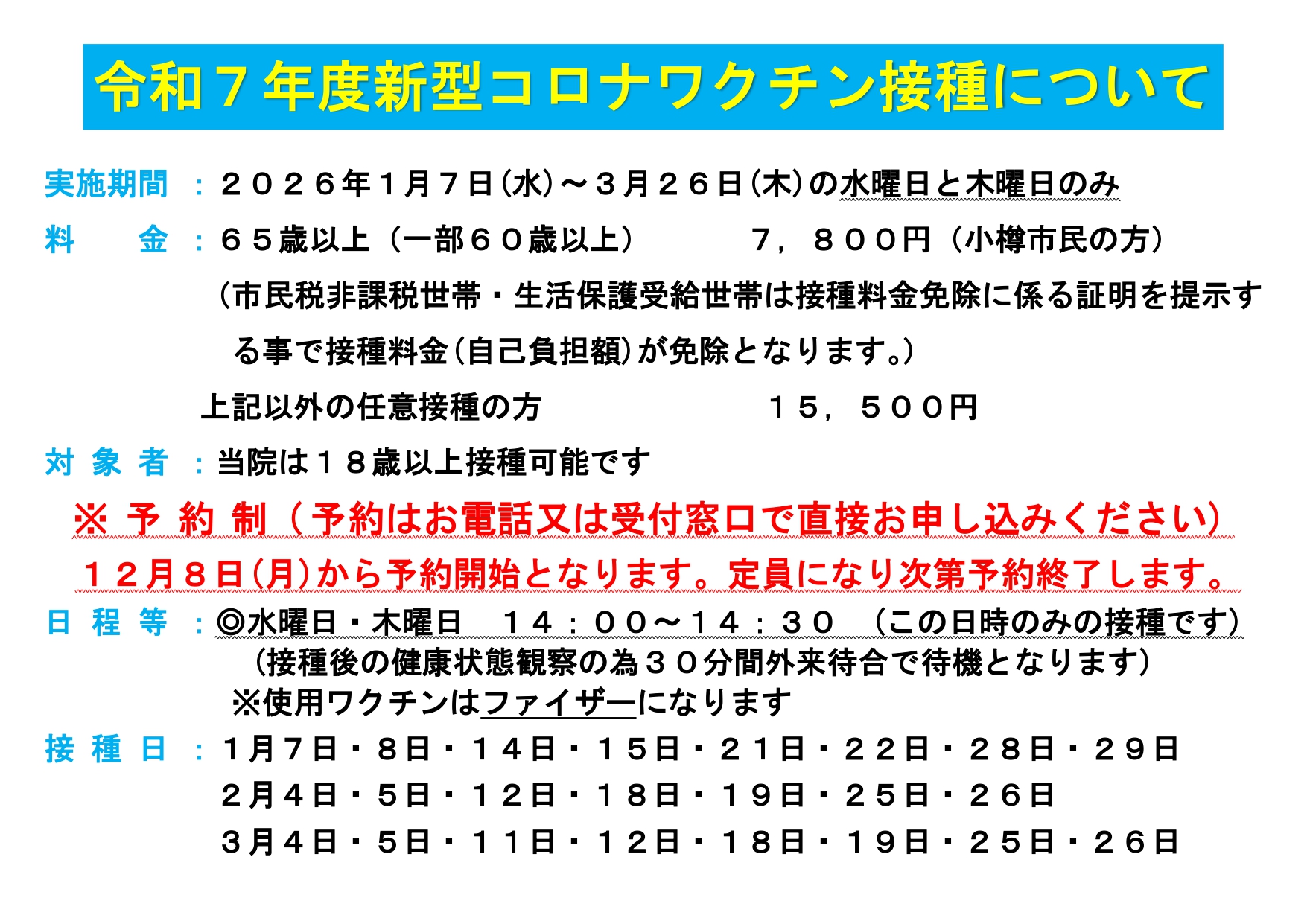 令和7年度新型コロナワクチン接種について 2025年12月8日(月)より新型コロナワクチン接種の予約開始となります。 電話か受付窓口にて直接お申込み下さい。 接種は年明け1月7日(水)より開始となります。 接種日は1月7日~3月26日の水曜日・木曜日 14:00~14:30のみの接種となります。