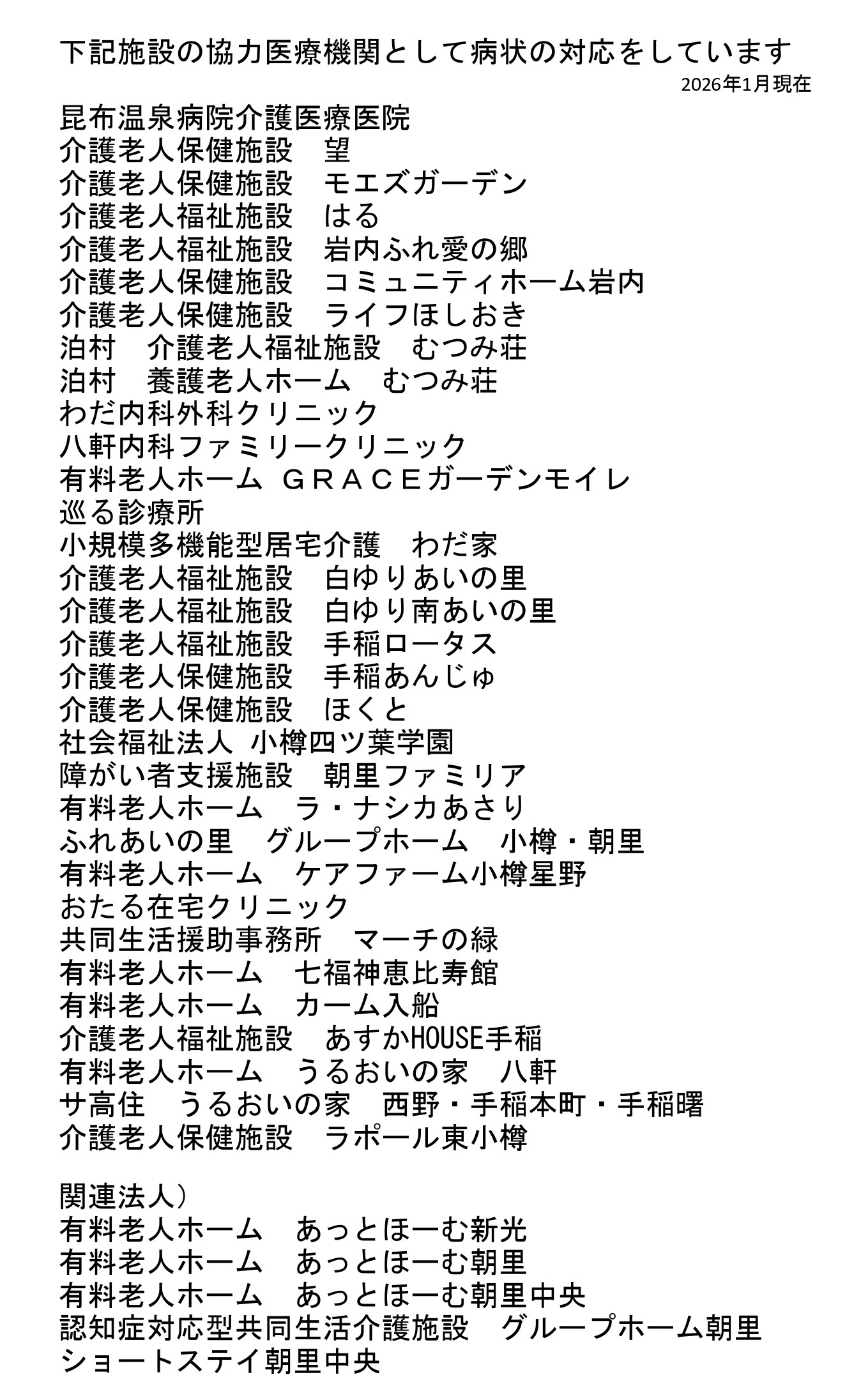急性期医療の充実、地域包括ケア病棟の効率化を目標として、隣接する「あっとほーむ朝里中央」等の介護系施設を展開し、「医療と介護の連携」を一層深化させようと計画しております。朝里中央病院は、今後もチーム医療の充実、情報の共有化、診療・看護の標準化に努力し、真の患者サービスの向上に尽してまいります。
